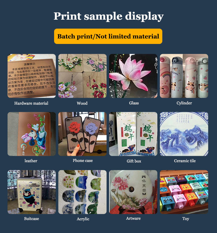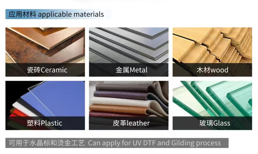 ইউভি প্রিন্টিং অ্যাপ্লিকেশন উপকরণঃ পিভিসি, প্রতিচ্ছবি ফিল্ম, ক্যানভাস, কার্পেট, চামড়া, কাচ, সিরামিক টাইলস, ধাতু, সিলিং, অ্যালুমিনিয়াম, কাঠ, দরজা, এক্রাইলিক বোর্ড, প্লেক্সগ্লাস বোর্ড, ফোম বোর্ড,কার্ডবোর্ডইত্যাদি।